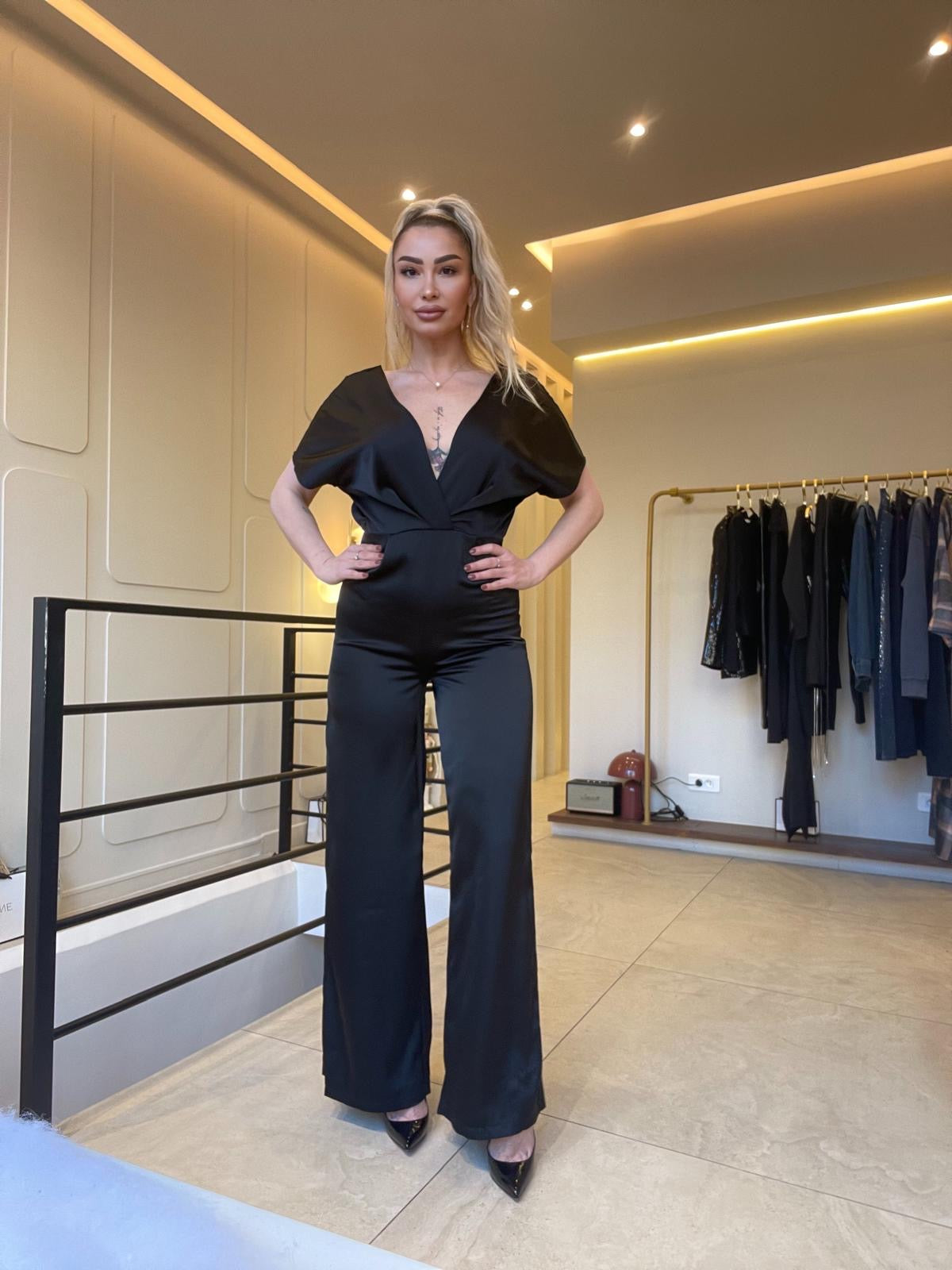 Cette combinaison noire en satin présente un dos ouvert pour un look élégant et moderne. Fabriquée à partir de tissu de qualité supérieure, elle offre confort et style pour toutes les occasions. Ajoutez une touche de sophistication à votre garde-robe avec cette combinaison polyvalente.