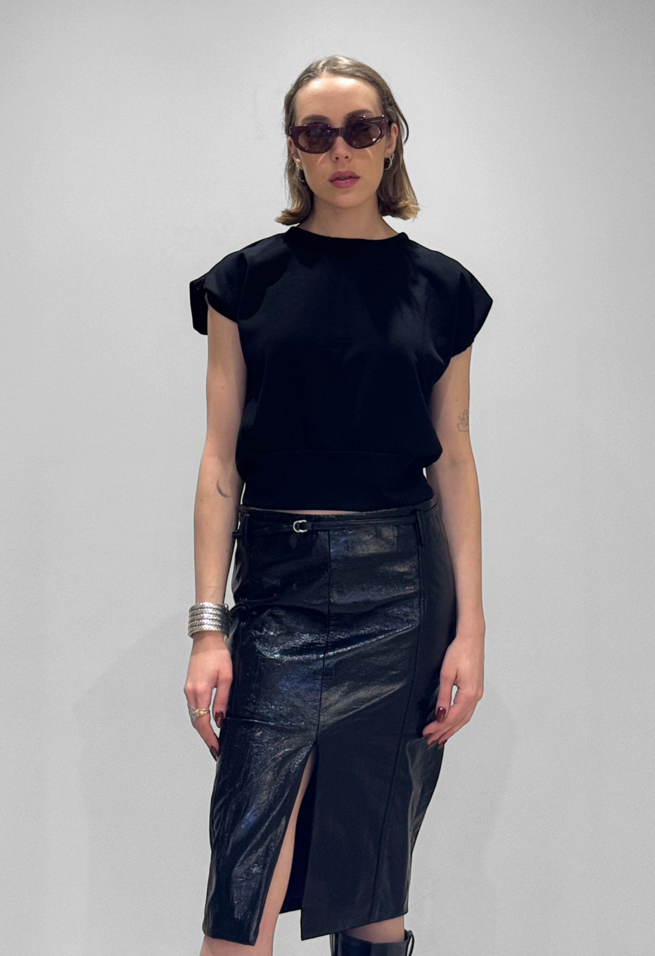 Affirmez votre style avec la jupe en simili cuir en motif peau de crocodile. Doublure 100% polyester. Disponible en deux coloris : marron chocolat et noir.